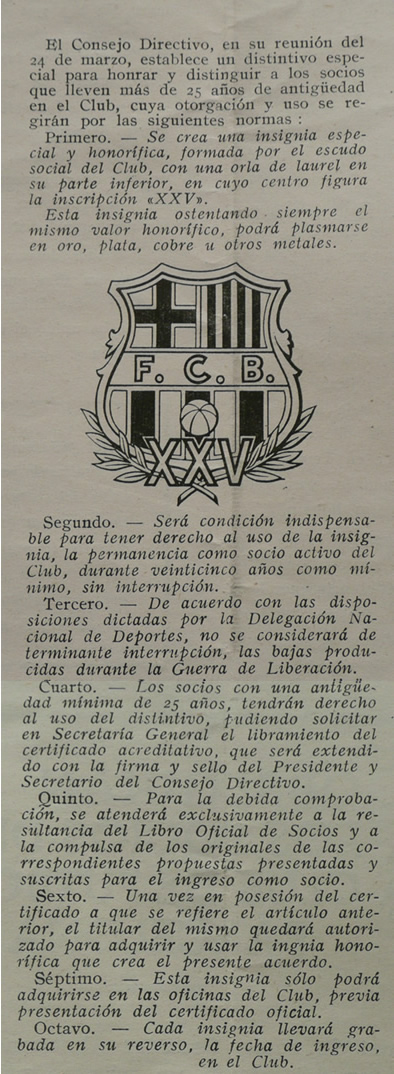 Carta Oficial del FC Barcelona. Descripció i condicions de les Insígnies de 25 anys de Soci del Barça. Març de 1955.