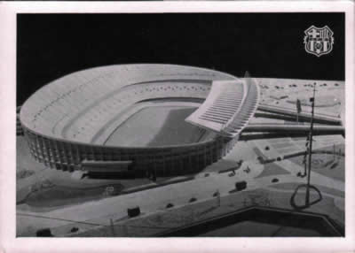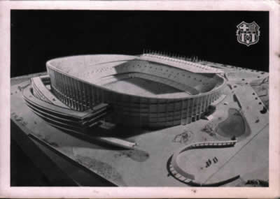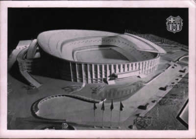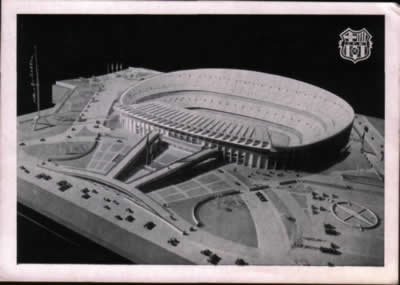 En aquesta imatge de la maqueta del Nou Camp es pot llegir: "ESTADIO DE LAS CORTS CLUB DE FUTBOL BARCELONA".