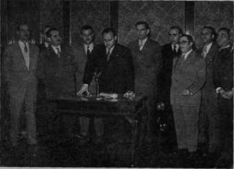 Entre los relámpagos producidos por las máquinas de los fotógrafos, la extraordinaria iluminación de los fo- cos instalados por los operadores del NODO, la diversidad de micrófonos de las emisoras, y el murmullo de las conversaciones de ln numerosa con-